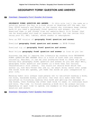 Read Online Geography Form1 Question And Answer Epub online is a convenient and frugal way to read Geography Form1 Question And Answer you love right from the comfort of your own home. Yes, there sites where you can get Epub "for free" but the ones listed below are clean from viruses and completely legal to use.